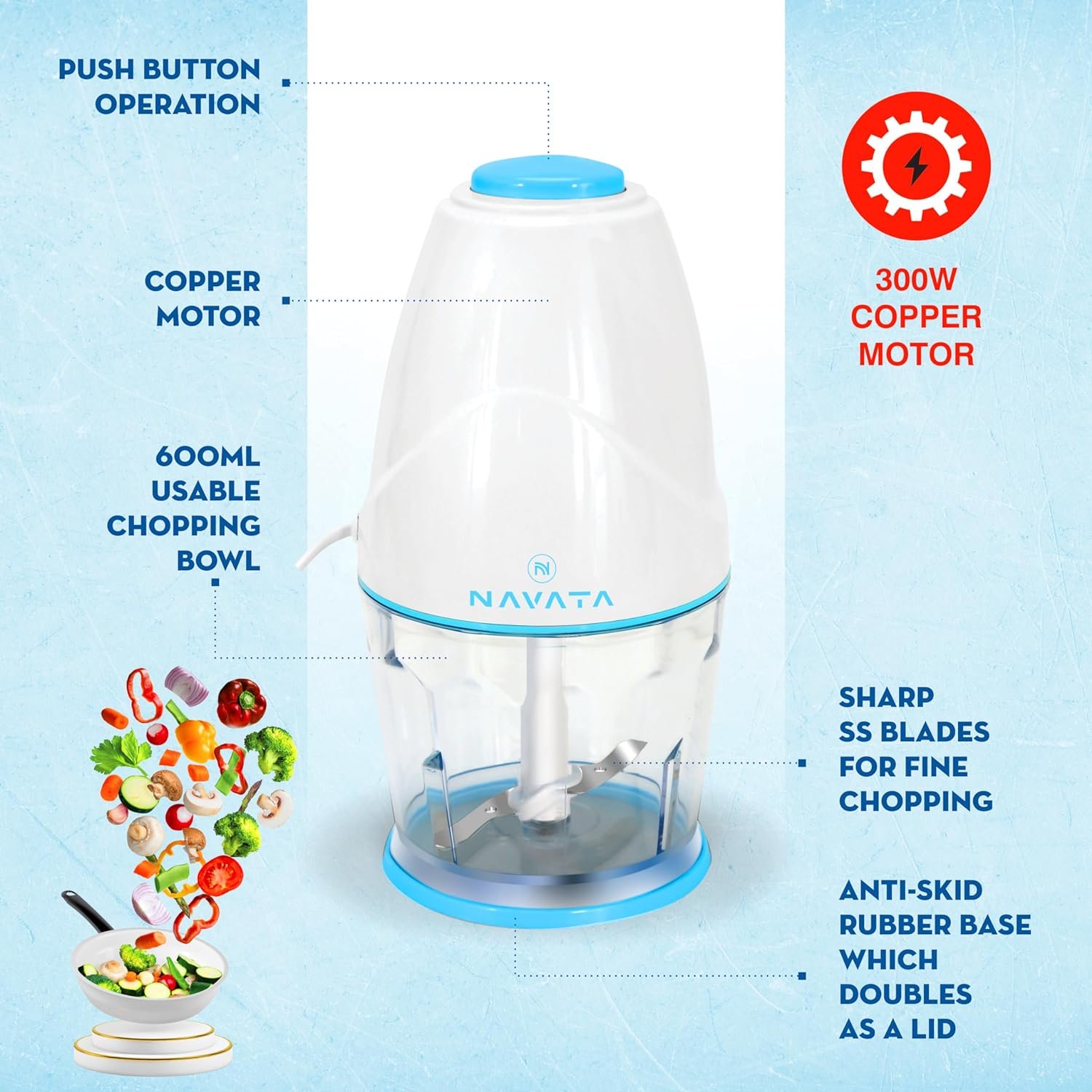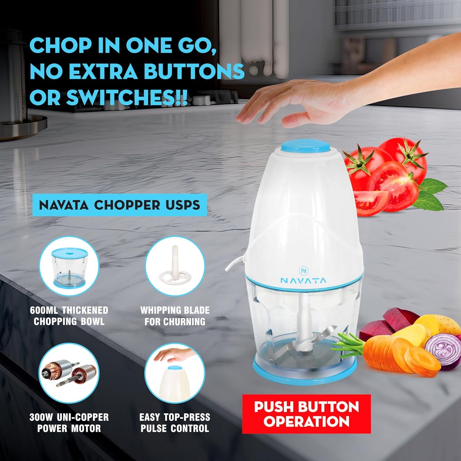 NAVATA Electric 300Watts Electric Chopper for Kitchen, Two Blade Technology, 600 ml plastic bowl with lid, Vegetable Chopper, Cutter, Chop, Mince, Dice, Whisk, Blend (Domino, Large)